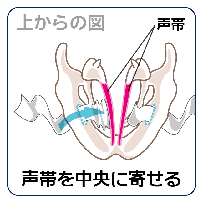 声が嗄れる原因は、声帯の年齢的な萎縮または病気で声帯の動きが悪くなり、発声時に声帯と声帯の間に隙間ができることです。当院では、この隙間を埋めるために声帯の外側に医療用特殊繊維を埋め込む手術を行っております(甲状軟骨形成術)。この手術は局所麻酔で行い、手術中に意識がある状態で声を出してもらいながら声を調整します。実際に声を聞きながら調整するので効果が確実に得られます。